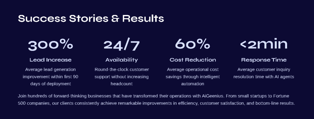 Let AiGeenius AI agents and automation scale your business smarter. Take the first step towards operational excellence and customer service that never sleeps. Our team of AI specialists is ready to design a custom solution that fits your unique business needs